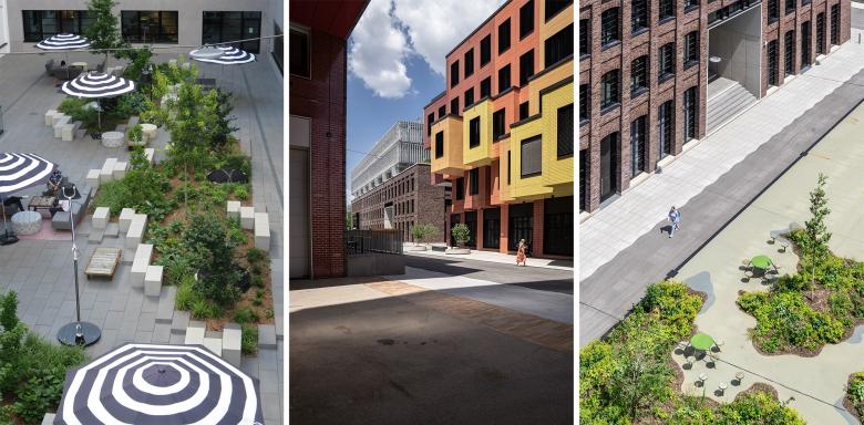Die Macherei verhandelt Freiraumqualitäten in einer neuen städtischen Dichte. Vielfalt, Lebendigkeit und präzise Identitäten sind die Antwort auf den hohen Druck im begrenzten Raum. Hohe funktionale Zwänge, große Baukörper und eine nahezu flächige Unterbauung mit einer zweigeschossigen Tiefgarage begrenzen den Spielraum der Freiräume stark. Die wenigen Freiflächen dienen der Erschließung, der Anlieferung, der Außengastronomie, und als Aufenthaltsflächen zugleich. In dieser räumlichen Enge muss jeder Quadratmeter mindestens drei Funktionen übernehmen. So ist an der Berg-am-Laim Straße in München mit der Macherei ein dichtes Gewerbequartier entstanden.
