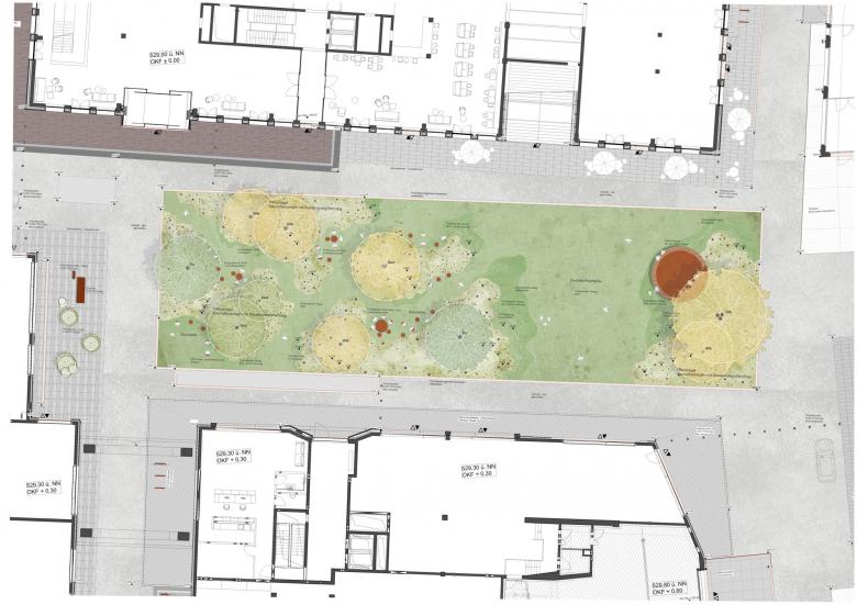Die Freiraumfigur, welche bajonettartig verschränkt ist, definiert die vier Baufelder. Die Erschließungsgassen binden an die umliegenden Straßen an. Ein Grünzug auf der Ostseite bildet ein wichtiges Bindeglied zwischen dem Echardinger Grünstreifen im Süden und der Wohnbauentwicklung Baumkirchen-Mitte im Norden. Das Herz der Macherei bildet eine zentrale, vielseitig nutzbare Platzfläche, die sich wie ein „grünes Kissen“ mitten ins Quartier legt. Die topographisch gestaltete Fläche strukturiert den Raum kleinteilig. Sie ermöglicht zudem bei geringer Aufbauhöhe die Pflanzung von Großbäumen. Das bewirkt, dass der Platz über die Gassen hinweg in die umgebenden Straßenräume adressiert. Der Platz ist mit einer speziellen durchgehenden Belagsfläche aus Farbasphalt mit unterschiedlicher Oberflächentextur gestaltet. Wie ein grünes gemustertes Tuch liegt er mitten im Quartier.