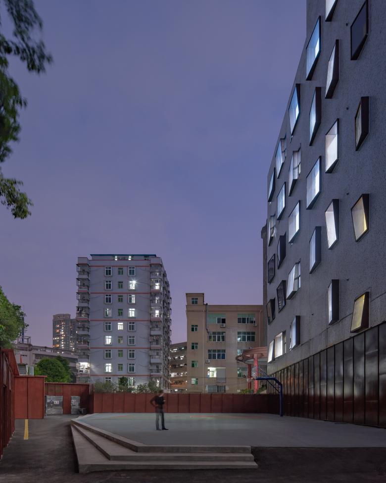 The wall on the north side of the park was removed to form an outdoor square. The single-story dilapidated building at the edge was reinforced and converted into electric room and garbage station. A completely new boundary of the park was integrated with the facade of the first floor of the buildings. Badminton and basketball fields as well as rest stools were arranged in the site to provide a leisure and fitness place for the employees.