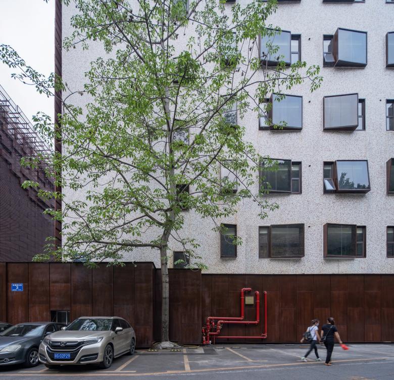 The characteristics and materials of the original buildings were carefully preserved. New design elements were applying to the ground floor, passage facade, and windows to contrast and resonate with the preserved building, which was also a response and respect to the original texture. The first floor is the equipment storage and mechanical loading area, rust steel plate was used on the wall as a skin for protection. A trumpet-shaped entrance was built into Building 1 as a public area for trucks to pass and load goods, connecting the two sites of the park.