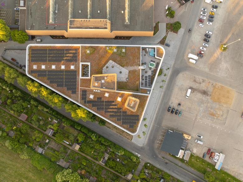 Das Main Bad überzeugt nicht nur architektonisch, sondern auch ökologisch. Bereits die kompakte, dreigeschossige Kubatur trägt zur Energieeffizienz des Gebäudes bei, da sie die Gebäudehülle im Verhältnis zum Volumen reduziert und dadurch Wärmeverluste minimiert. Öffnungen und Fassadenflächen sind im Hinblick auf Tageslichtnutzung, Energieeffizienz und thermische Performance optimiert. Dachoberlichter führen natürliches Licht tief ins Gebäudeinnere, verbessern die Aufenthaltsqualität und reduzieren den Bedarf künstlicher Beleuchtung; zugleich ermöglichen sie passive solare Energiegewinne.