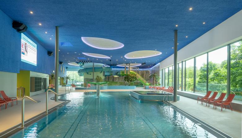 In der Freizeitbadehalle sind zahlreiche Attraktionen geboten: Ein Erlebnisbecken mit Sprudeltopf und Warmsprudelbecken sowie ein Kleinkinderbereich mit Hängebrücke und Spraypark. Für zusätzlichen Badespaß sorgen eine Breitwellenrutsche und eine innenliegende Röhrenrutsche – letzteres auch mit Blick auf Energieeffizienz, da auf eine Außenrutsche verzichtet wurde.