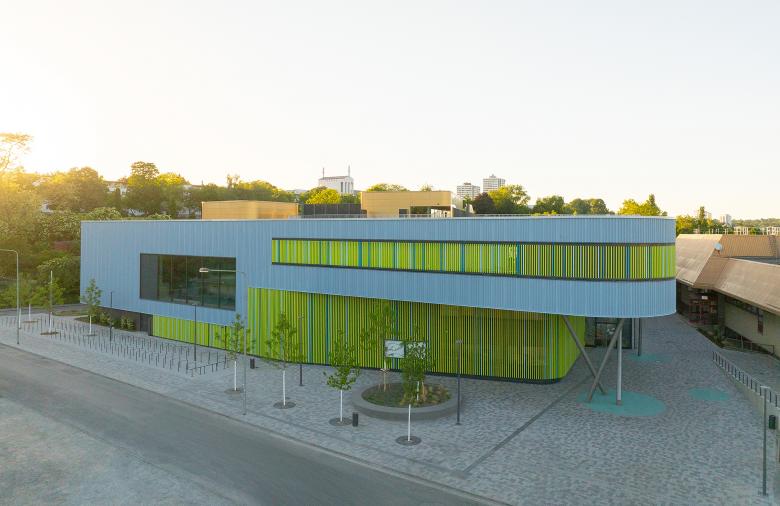 In direkter Nachbarschaft zur Eissporthalle entwickelten 4a Architekten als Generalplaner einen dreigeschossigen Baukörper, der sich kompakt in die bestehende städtebauliche Struktur einfügt und den verfügbaren Raum effizient nutzt. Das Main Bad umfasst rund 900 Quadratmeter Wasserfläche für Freizeit, Sport und Erholung. Der Entwurf zeichnet sich durch eine klare, reduzierte Formensprache aus. Geschmeidige Rundungen und ein Fassadeneinschnitt im Eingangsbereich verleihen der dreieckigen Gebäudeform Dynamik. Im Innenraum dominieren Fliesen, verputzte Flächen und akustisch wirksame Oberflächen, die nicht nur gestalterisch ruhig wirken, sondern sich auch besonders gut reinigen und Instand halten lassen. Das Farbkonzept setzt auf kräftige Blau-, Grün- und Gelbtöne, die für Lebendigkeit sorgen. Auch die Fassadengestaltung prägt ein ruhiges und strukturiertes Material- und Farbkonzept: Auf das begrünte Sockelgeschoss folgt eine gelochte und gewellte Aluminiumverkleidung, die von farbigen Metalllamellen und verglasten Elementen durchbrochen wird.