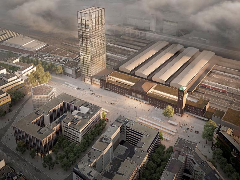 Der neue Hochpunkt des Quartiers versteht sich als vertikale Fortführung des Bahnhofvolumens und als Zielpunkt der Immermannstraße. Der Turm steht also nicht als Solitär am Platz, sondern bildet mit dem Bahnhof ein Gesamtgefüge. Dazu gehört auch, dass unter dem Vorbau des Turmes, mit dem er an den Bestand anschließt, eine gemeinsame Erschließung liegt. Kreuzförmig gruppieren sich hier die Zugänge zur nördlichen Seitenhalle des Bahnhofs, zu den Büroflächen und den öffentlichen Aussichtsterrassen des Turmes, als auch zum Konrad Adenauer Platz.