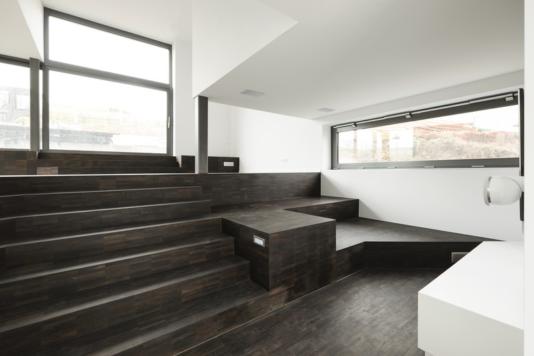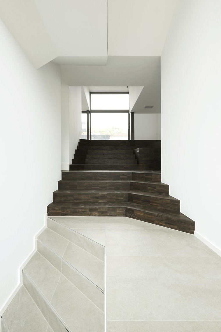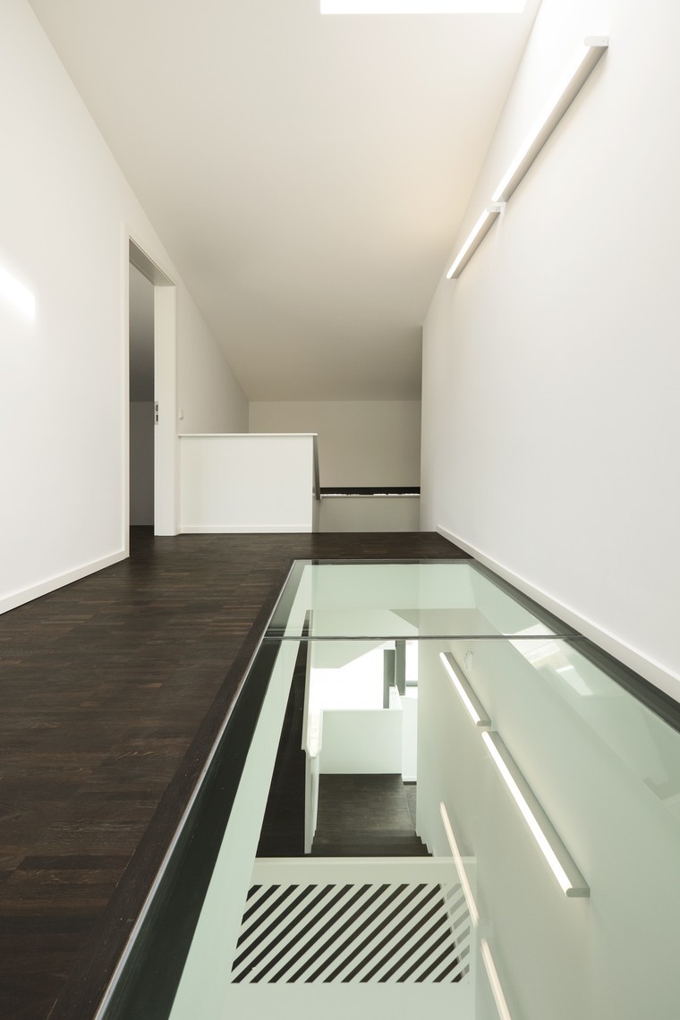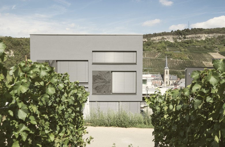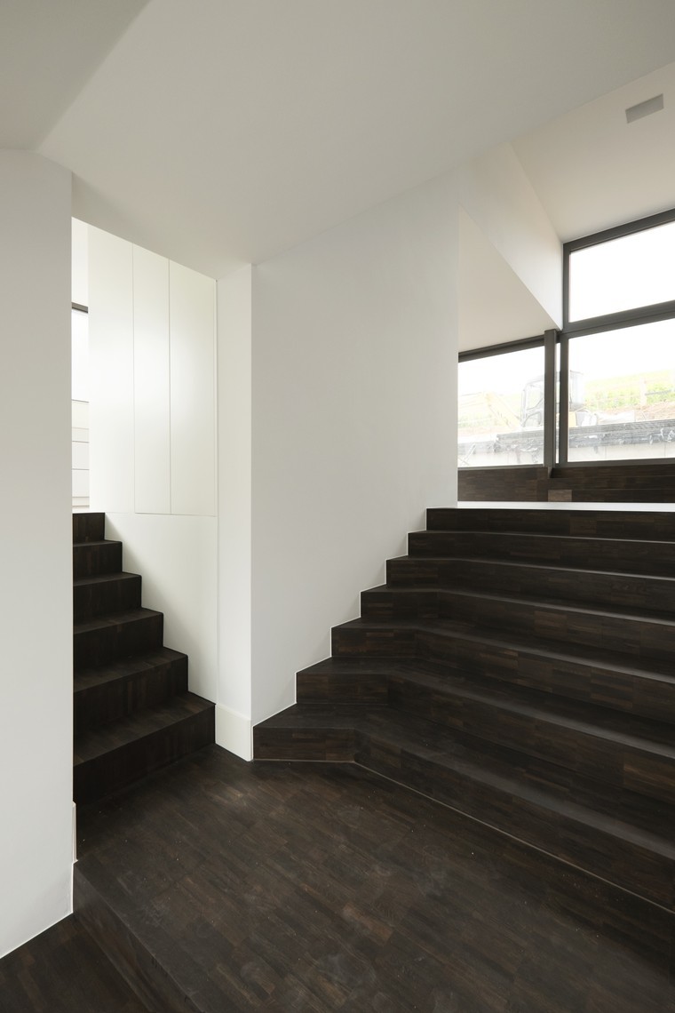 The villa is located in the valley of the mosel river at the border between luxembourg and germany. the site is directly attached to the vineyards and the section of the house therefore incorporates this topographical condition. the main living area is developed as an open plan with multiple split levels. this main floor expresses its connection to the landscape with the continuous glass band. the upper floors, where bedrooms, recreation spaces and bathrooms are located, are developed as a raumplan organization from the main living level.