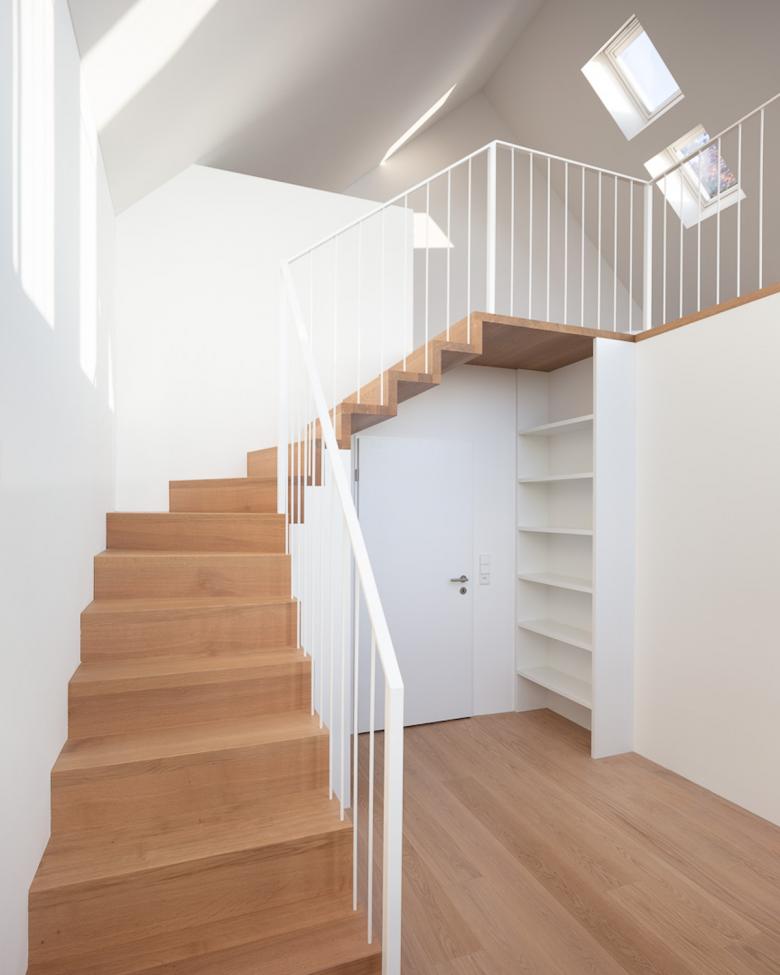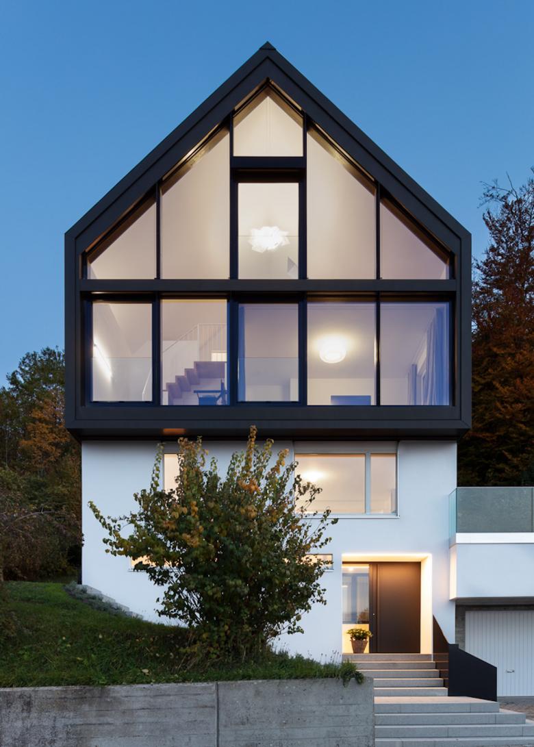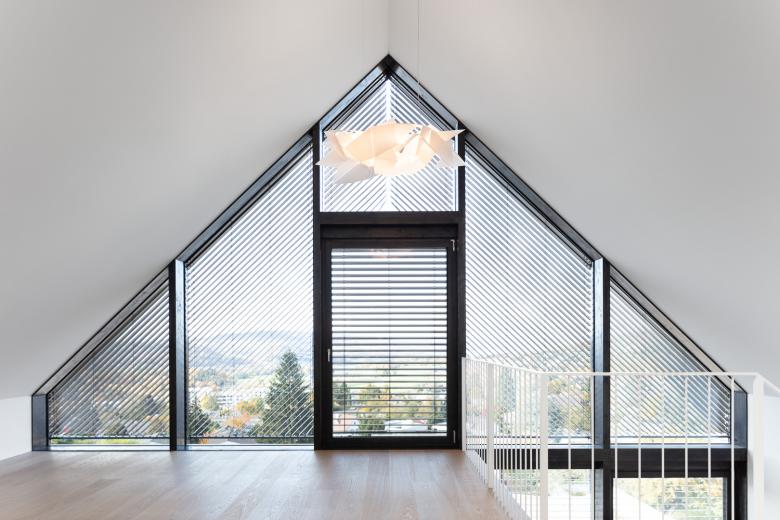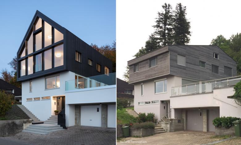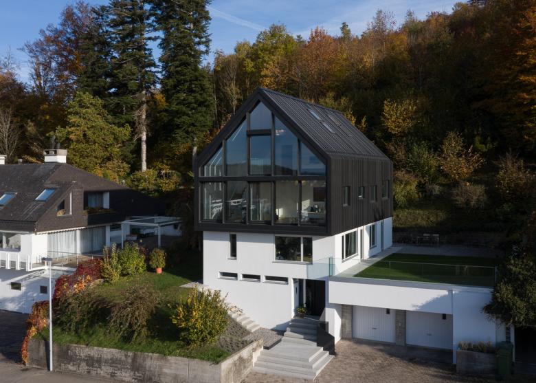 This house in Zurich was originally built in the 70's. It is part of our upcycling series, aiming at the reduction of grey energy waste in the building industry. Instead of demolishing and rebuilding the entire house, we decided to preserve all valuable building parts and to add a rooftop addition constructed with prefabricated timber elements. Now, the renovated house fulfils highest energy saving standards. A titanium zinc cladding packages old and new building parts into one consistent volume. As a response to the location of the site with fantastic landscape views, the gable facade of the upper floors has been fully glazed.