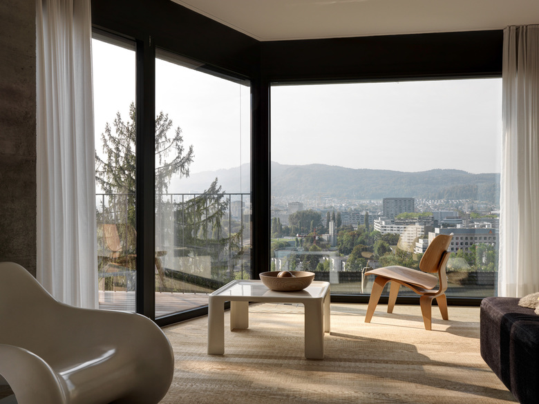 Hürlemann schuf für eine Familie eine 130 m2 grosse Raumskulptur auf zwei Ebenen. Die Wohnung hat eine offene Struktur – nur das Kinderzimmer und die beiden Bäder verfügen über Flügeltüren. Das Elternschlafzimmer in der Raumerweiterung am Ende des Flurs kann zusammen mit Bad und Studio mittels Schiebetüre zu einer Ruhezone abgetrennt werden. Dank zwei Reduits und zahlreichen Einbauschränken kommt die Wohnung ganz ohne zusätzliche Stauraummöbel aus. So trennt im EG ein 13 m langer, von beiden Seiten bespielbarer Schrankkörper aus Räuchereiche die Zimmer vom Flur.