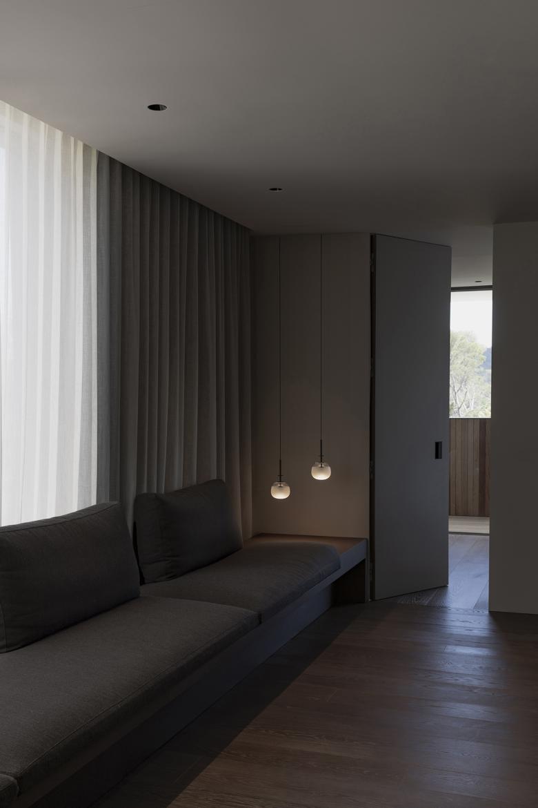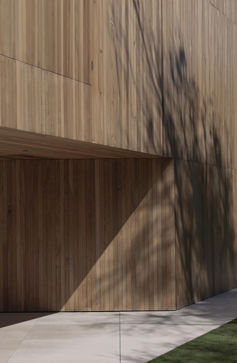 Los materiales elegidos juegan un papel fundamental en la definición estética y funcional del proyecto. En el exterior, el uso de hormigón blanco y madera de cedro canadiense aporta solidez a la vez que calidez a la estructura. En el interior, en cambio, el roble teñido en oscuro busca conseguir una mayor sensación de intimidad frente a las generosas dimensiones de las estancias.
