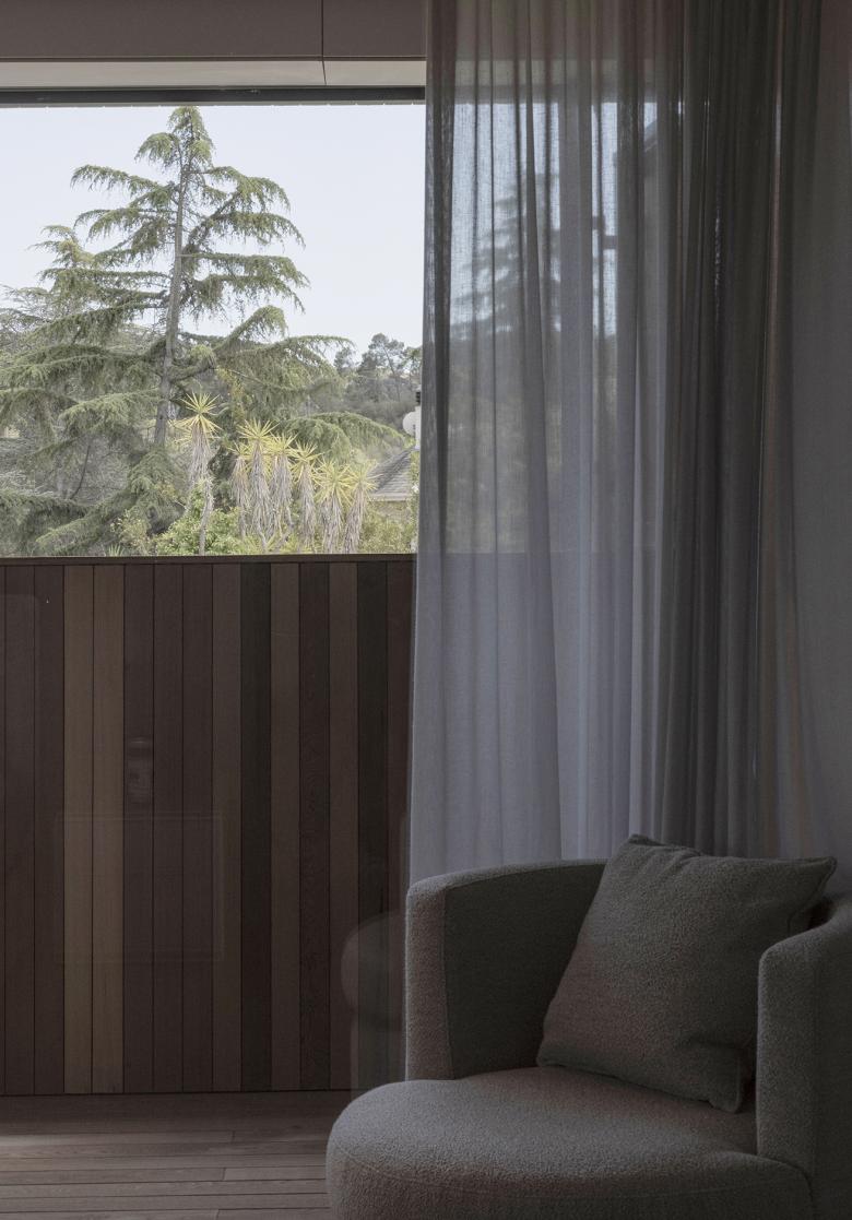 La terraza se proyecta como una extensión natural del interior, donde la zona de cocina se expande hacia fuera, creando un área de descanso y transición entre la vivienda y la vegetación circundante. La zona de la piscina, concebida como el punto de exclamación de la arquitectura, se sitúa estratégicamente para aprovechar al máximo las horas de sol.