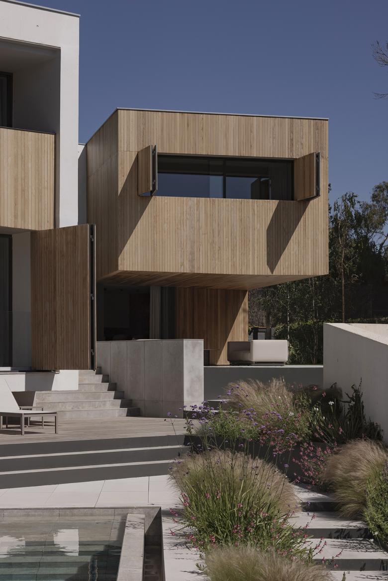 Proyectada sobre una parcela compleja y diseñada en favor de las vistas, la arquitectura de esta nueva vivienda unifamiliar se basa en un contundente juego de volúmenes que utiliza grandes porticones de lamas de madera para relacionarse con el paisaje de una forma única.
