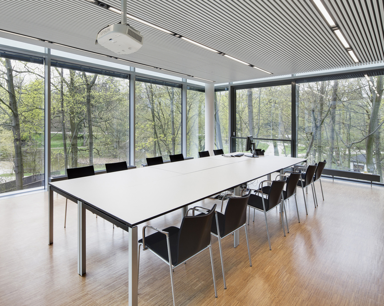 Das Gebäude gliedert sich in einen massiven Betonsockel und einen offen gestalteten Bereich der Forschungsabteilungen. Durch die Ausbildung einer umlaufenden, horizontal gegliederten Fassadenkonstruktion ist es möglich, die verschiedenen Nutzungen mit ihren individuellen Bedürfnissen nach Belichtung und Belüftung zu einer homogenen Gestalt zusammenzuführen. Das Zentrum bildet die 3-geschossige Halle mit ihrer freitragenden Stahltreppe, um die sich alle zentralen Einrichtungen des Institutes anordnen. Raumprägend sind die offenen Galerien mit ihrem Ausblick auf die Baumreihen entlang der Uferböschung. Die vorhandenen Sitzinseln und Teeküchen sollen die Kommunikation und Begegnung der Mitarbeiter der einzelnen Abteilungen fördern.