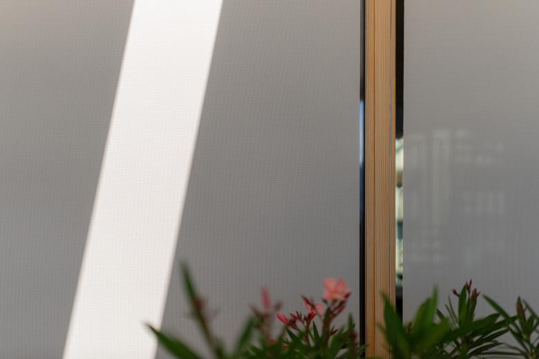Wenn es darum geht, hohe Designansprüche mit einer funktionalen Beschattungslösung zu kombinieren, sind Vertikalstoffstoren eine äusserst gute Wahl. Ihre Vorteile liegen zum einen in der Ästhetik: Sie lassen sich mit ihrem reduzierten Design und ihren vielfältigen Farbmöglichkeiten besonders gut in die moderne Fassadengestaltung einfügen. Um die sinnliche Atmosphäre des Holzhauses zu unterstützen, wurde aus der Vielzahl an Farben ein bräunlicher Stoff gewählt. Zum anderen überzeugt die Funktionalität: Die Stoffe filtern 97% der Lichtstrahlung heraus und schirmen so blendendes Sonnenlicht und wärmende Sonnenstrahlen ab.