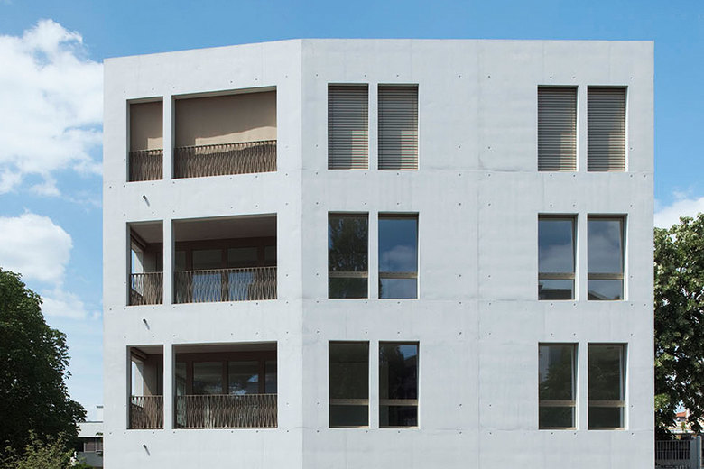 Das polygonal geschnittene Volumen ist als Antwort auf die komplexe städtebauliche Situation zu verstehen; Ein eigenständiger, einfacher Baukörper, der aber Bezüge sowohl zum Strassenraum als auch zum Bestehenden aufnimmt und auch als Kopf- oder Eckbau der Häuserreihe an der Stapferstrasse gelesen werden kann. Öffnungen für Büros, Wohnräume und Loggias werden gleich behandelt. Dadurch wird der Eindruck eines Mehrfamilienhauses vermieden. Schlanke Stützen zwischen den Fenstern bilden ein durchlaufendes Gestaltungselement und sind als Referenz an die alten Bürgerhäuser des Quartiers zu verstehen.