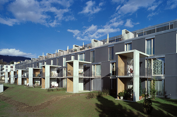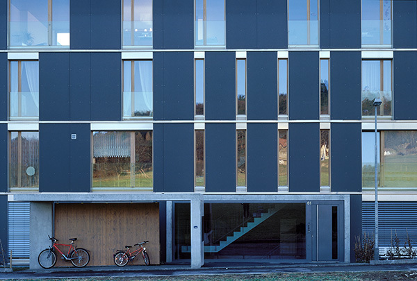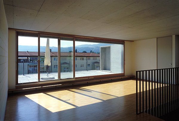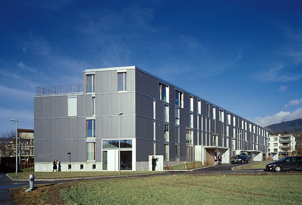 Die Wohnüberbauung an der Peripherie der Stadt Biel ist Teil eines grossen durch das städtische Planungsamt erstellten Überbauungsplans. Vorgegebene Baufelder und 3 1/2-geschossige Bauhöhen bestimmten die Volumina. Das ca. 70 Meter lange Haus wird in drei Einheiten gegliedert und durch eine vierte Kopfbaueinheit südlich abgeschlossen. Das Wohnhaus basiert auf einem Mix aus Geschoss- und Duplexwohnungen. Im Erd- und 1. Obergeschoss befinden sich durchgehende Ost-West orientierte 3 1/2 und 4 1/2 Etagenwohnungen. Im 2. Obergeschoss und Attika sind 3 1/2, 5 1/2 und 6 1/2 Duplexwohnungen angeordnet, wobei sich die Wohnbereiche zusammen mit den vorgelagerten Terrassen jeweils im Attikageschoss befinden. Der Bau ist in Schottenbauweise mit Kalksandsteinmauerwerk und Betondecken ausgeführt. Diese Konstruktion erlaubte eine nichttragende vorfabrizierte Holzrahmenbauweise für die Fassaden. Der Ausbau wird durch rohe, mittels Ausführung und Gestaltung veredelte Materialien bestimmt. Lasierter Beton und gestrichener Kalksandstein im Innenbereich, Eichenfenster, Aluminiumleibungen und durchgefärbte Pelichromplatten im Aussenbereich.