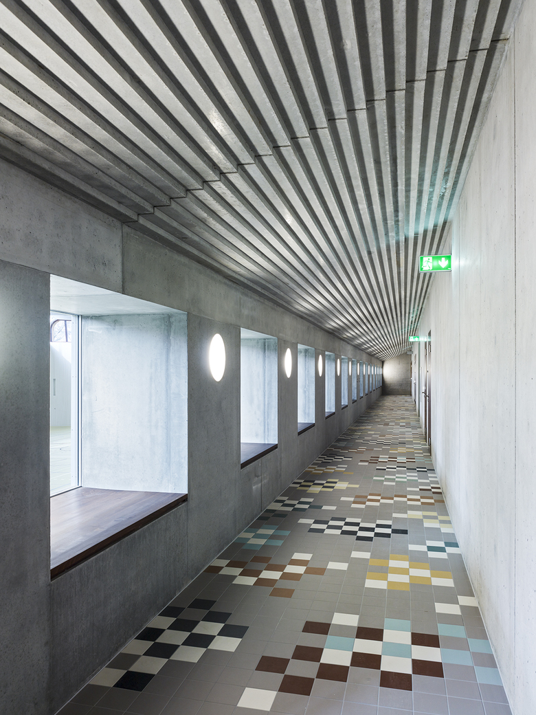 Als grösstes Volumen der Schulanlage schafft die neue Sporthalle eine räumliche Verdichtung zum Haupteingang des Eggschulhauses und gibt gleichzeitig grösstmögliche Durchblicke zur parkartigen Oberstufenanlage frei. Sie verbindet die Schulen Egg und Lendenbach. Das Foyer auf dem Pausenplatzniveau gewährt einen Rundumblick auf die Gesamtanlage und wird gesäumt von den Baumkronen des üppig bestockten Lendenbachs. Geprägt durch die elegante Tragstruktur, bildet es die Vorzone zur Tribüne und zum hohen Hallenraum. Eine einladende Treppe führt vorbei am Garderobengeschoss in eine Vorhalle auf der Sportebene. Diese kann mit dem Mehrzwecksaal verbunden und so als zweites Foyer genutzt werden. Die Anordnung ermöglicht eine vielseitige Nutzung, sowohl für den Schulbetrieb als auch für Sport- und Gemeindeanlässe.