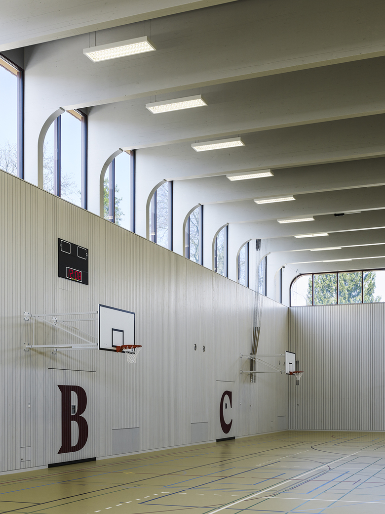 Dank der statischen Möglichkeiten von Brettschichtholz-Trägern konnte die Weite der Halle von 31 Metern überspannt werden. Im grossen Foyer des oberen Geschosses mit den angrenzenden Zuschauertribünen wird die Eleganz der filigranen Holzkonstruktion sicht- und unmittelbar spürbar. Die Rundungen der Träger und die Verglasung zum neuen Pausenplatz erinnern an eine Veranda und gewähren Aussicht auf das gesamte Schulareal.