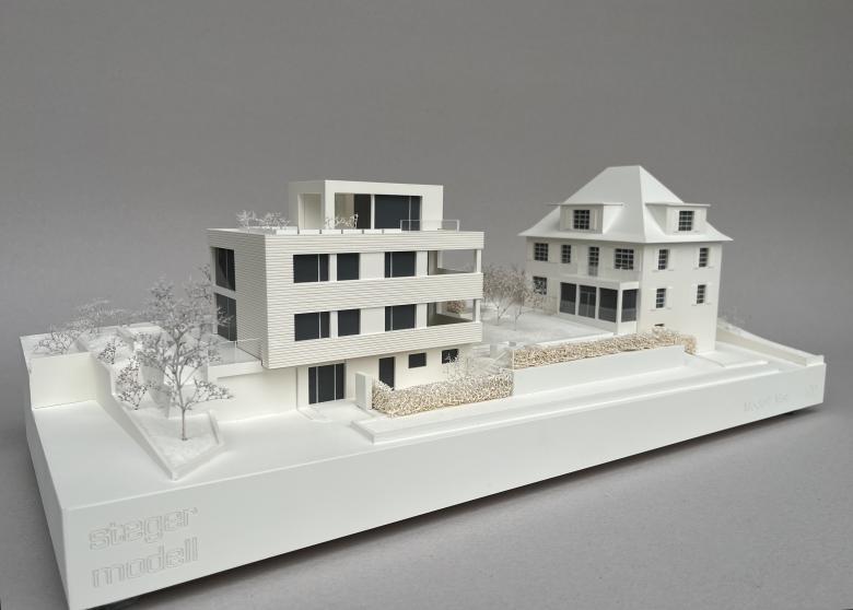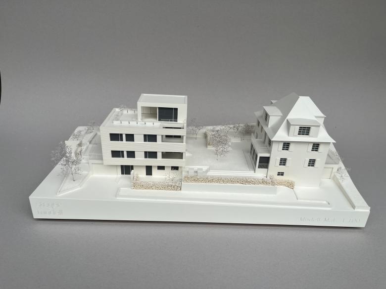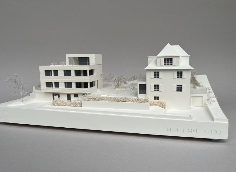 Architekturmodell 1:100 – Zur Präsentation für den Verkauf erstelltes Modell in Kunststoff und Holz.