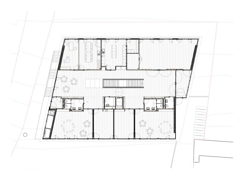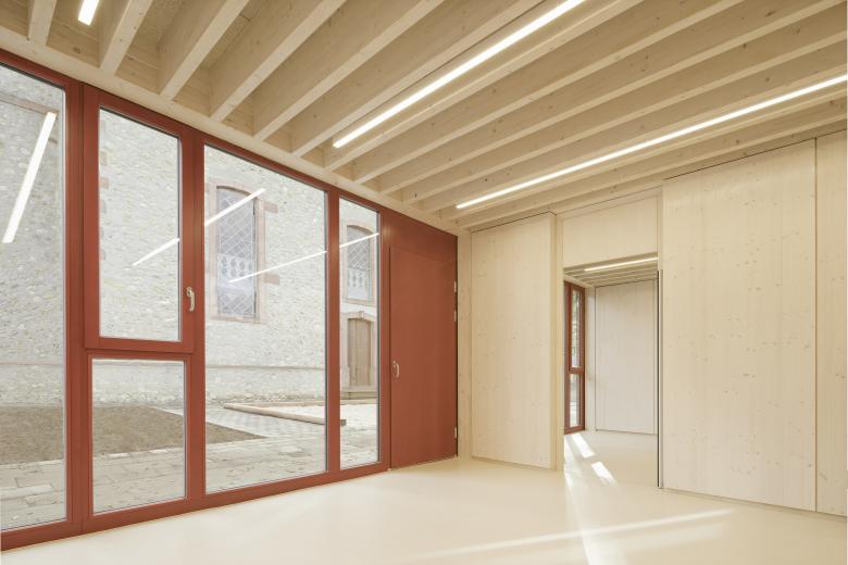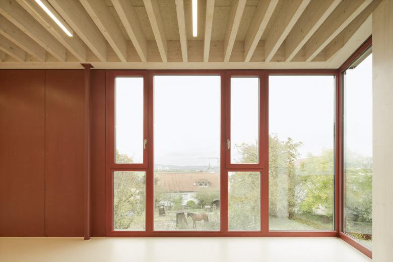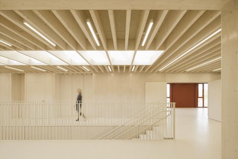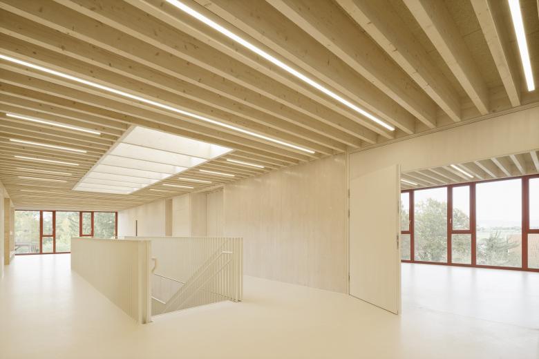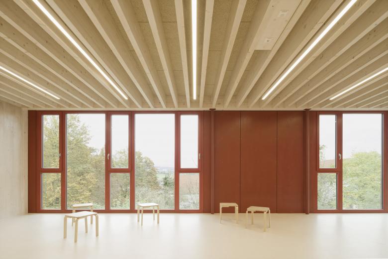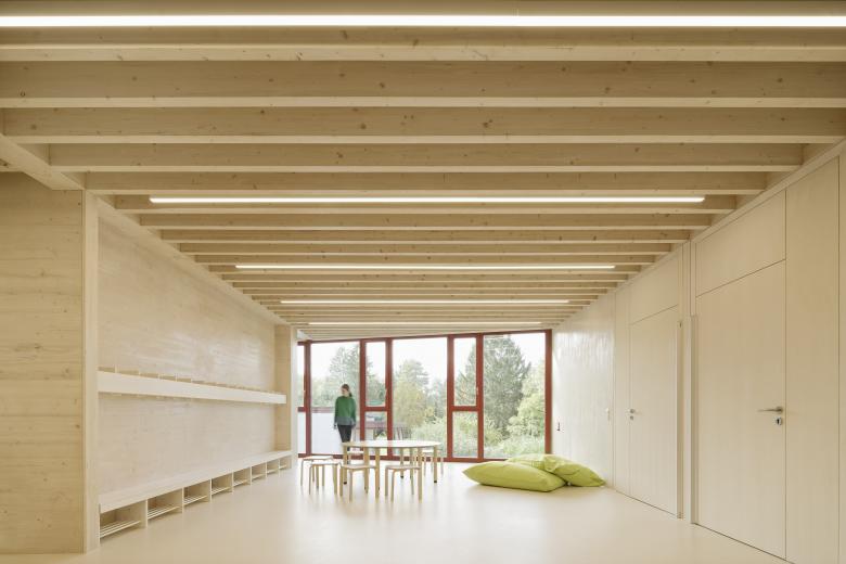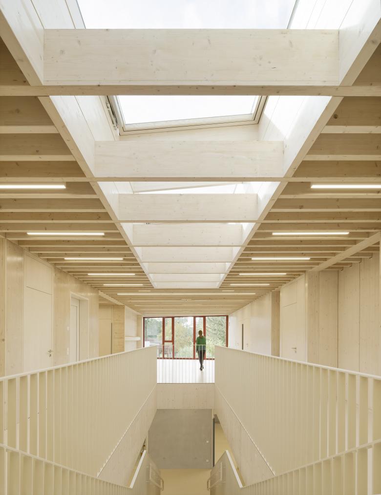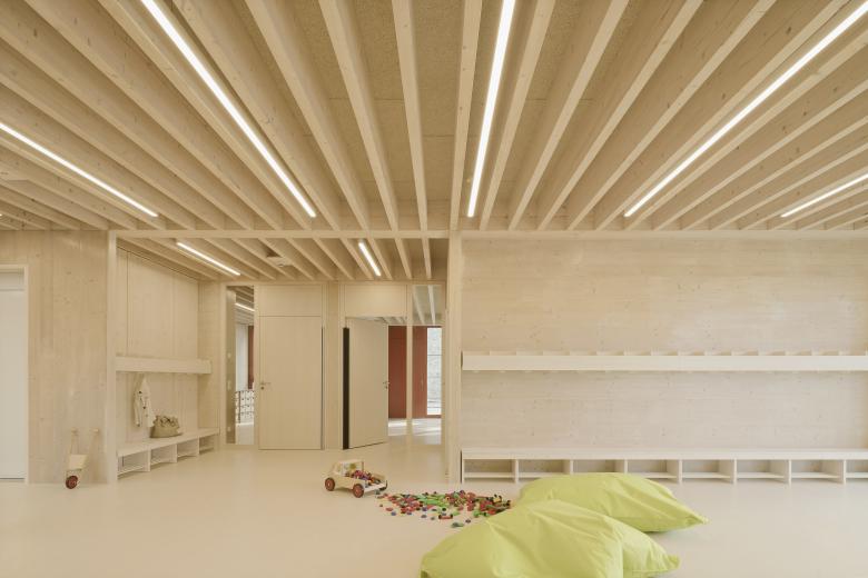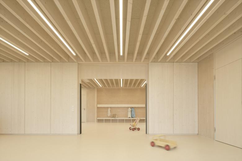 Das massive Sockelgeschoss öffnet sich mit einer großzügigen Glasfront talwärts und bietet hier zwei Gruppenbereichen einen direkten Zugang in den Garten. Das Zentrum der Kita bildet eine einläufige Treppe in der innenliegenden Halle, die beide Geschosse miteinander verbindet. Ein Oberlicht über der Freitreppe sorgt für eine hohe Aufenthaltsqualität in der Halle, welche multifunktionale Flächen für Spielen und gemeinsames Essen bietet. Der erdgeschossige Holzrahmenbau ruht auf der massiven auskragenden Decke des Sockelgeschosses. Es öffnet sich ebenerdig zur Gartenseite Richtung Michaeliskirche mit zwei weiteren Gruppen- und Intensivräumen. Talseitig befinden sich die Verwaltungsräume, die Küche und der Mehrzweckraum.