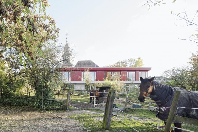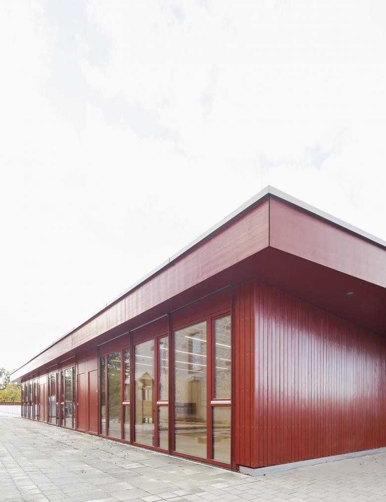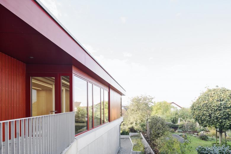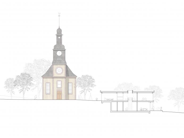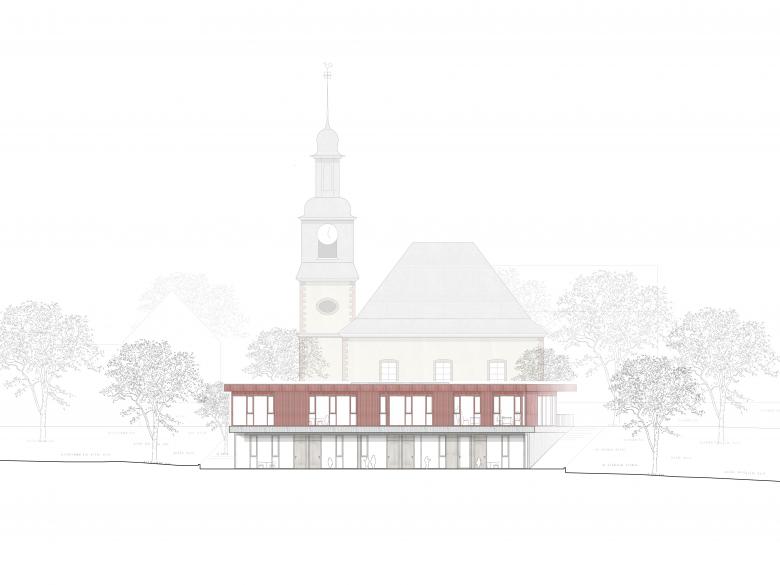 Der zweigeschossige Baukörper der Kindertagesstätte mit begrüntem Flachdach fügt sich durch die Hanglage des Grundstücks gefällig in die Nachbarschaft der Kirche ein.