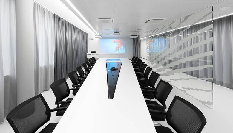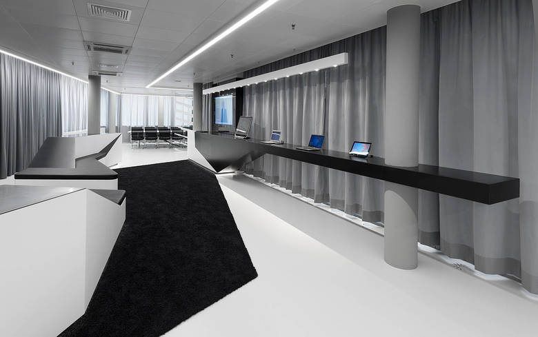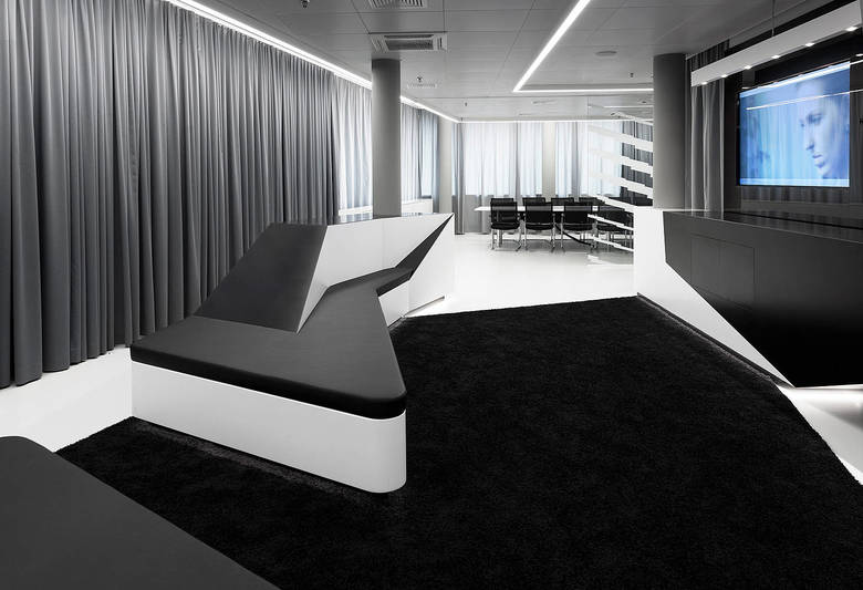 The color scheme of the rooms is strictly black and white. The aim of this monochrome design is to ensure a firm focus on media content, products and direct communication with customers/guests and visitors. A dynamic, technological, immaterial room which is brought to life by the constantly changing colors and content of the media as well as MICROSOFT's customers, staff and visitors.