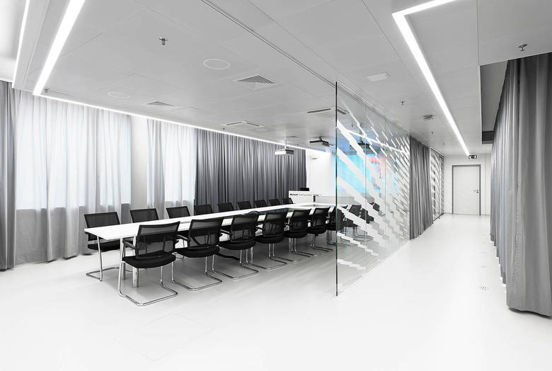 The black glass wall around the whole room integrates both media and practical functions (cloakroom/kitchenette/catering/storage space). The black glass wall is brought to life by reflections of the media. The graphic artwork on the glass walls works with the theme of reflection and absorption, of dissolving and compacting – spatially, content-wise and visually. This graphic design frames the whole area and on the glass partitions of the conference rooms also acts as a screen. The drapes round the room form a deliberate contrast to the otherwise hard technical surfaces. Two layers of drapes in different shades of gray and differing degrees of opaqueness offer the possibility to close off or open up the rooms to accommodate the needs of an event. In this way, the color, brightness and mood of the room can also be changed.
