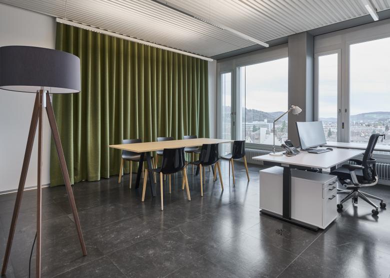 Die Büros wurden alle mit dem neuen Standardmobiliar des Kantons Zürich ausgestattet. Raumbildende Elemente wurden als Schreinerlösungen konzipiert. Zusammen mit den akustischen Vorhängen und dem Standardmobiliar ergeben sie ein stimmiges Farb- und Materialkonzept, welches sich angemessen ins räumliche und atmosphärische Gerüst des schmucklos funktionalen Grundausbau des Hochhauses einfügt.
