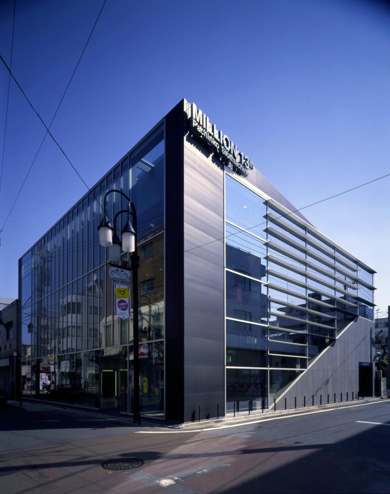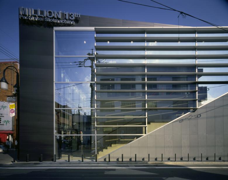 This building is a pachinko parlor situated on a T-junction corner facing the old Kawagoe Highway. The surrounding streetscape no longer features the rows of houses reminiscent of days gone by; instead, it consists of a chaotic jumble of indistinct, small-scale shops. In designing this building, the aim was to manifest the inherent energy latent within this site, nestled within such a landscape, and to create a structure that would serve as the starting point for restoring vitality and order to the streetscape.
