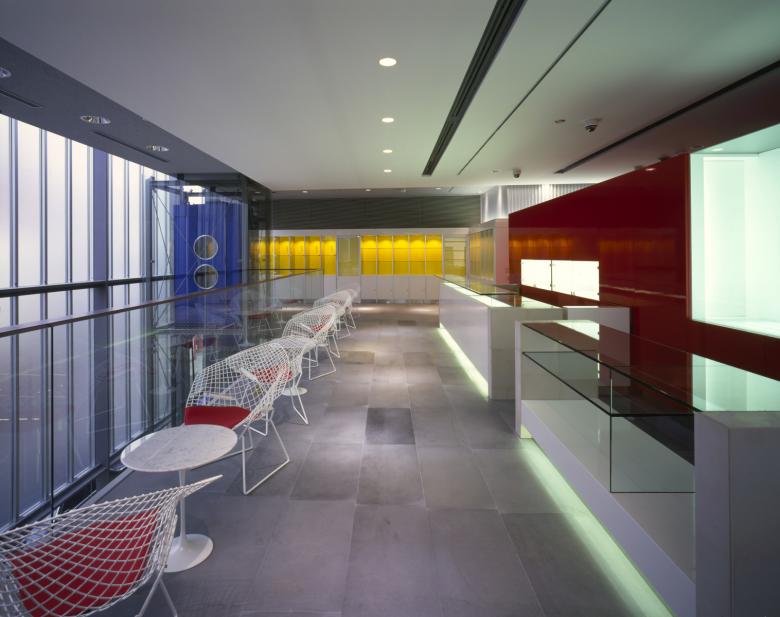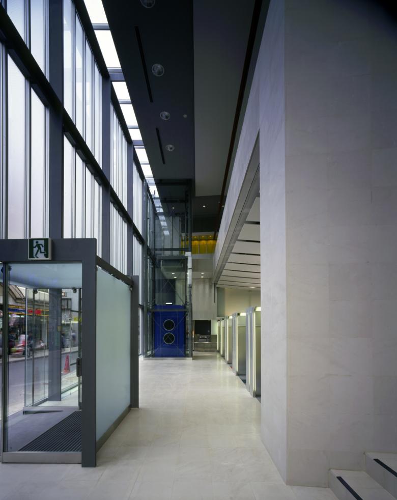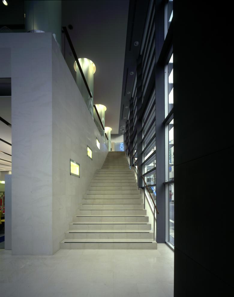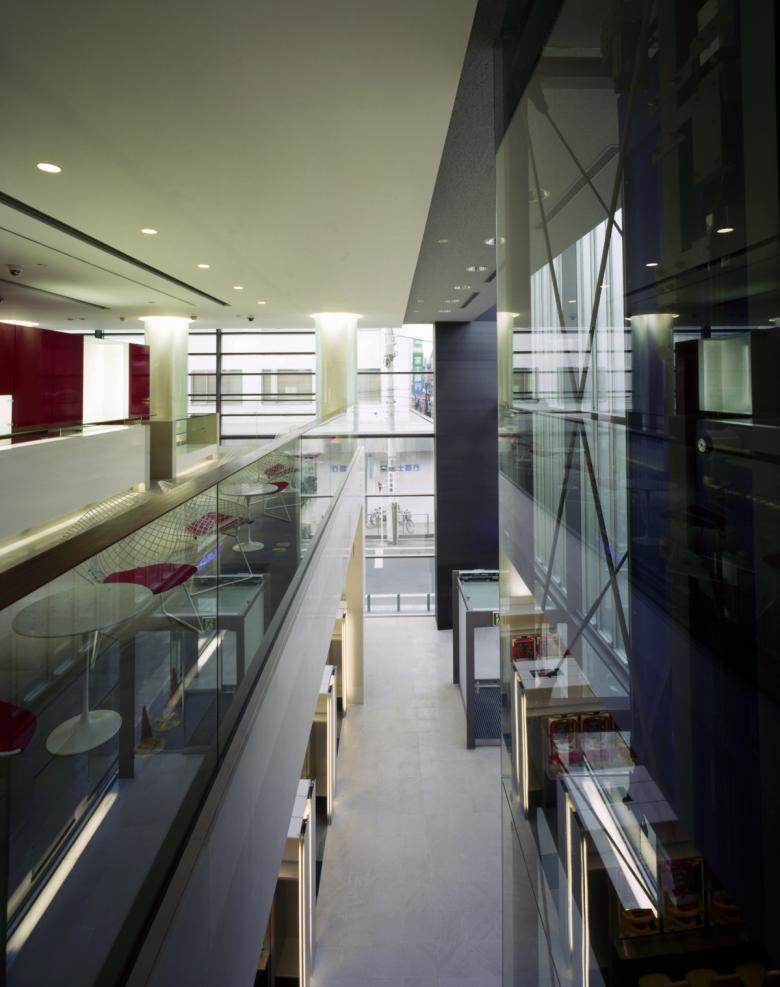 Furthermore, the north side facing the old Kawagoe Highway features a vertical glass screen to provide scale to the finely divided streetscape. The upper portion is frosted to diffuse the stable northern light into the interior spaces. The west side employs deep canopy-like sashes to reflect and diffuse the deeply penetrating western sunlight, creating a gentle, bright space for the stair area while providing a sense of horizontal expansion.