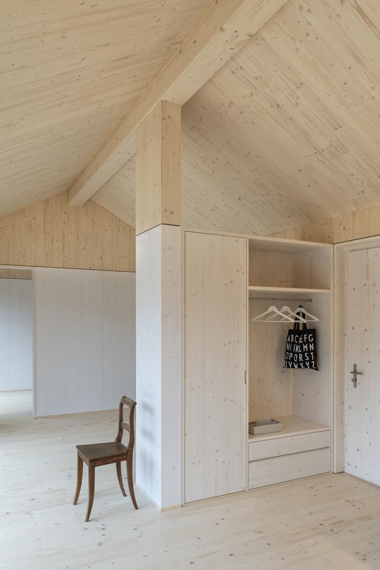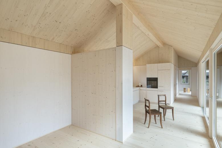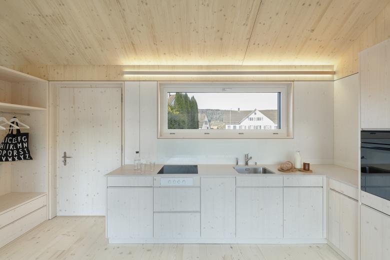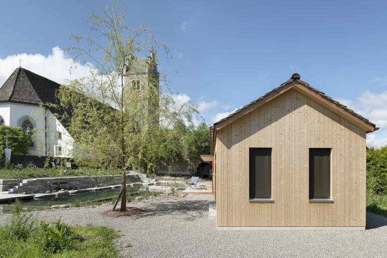 Das Minihaus in Lommis des Typus I-Form liegt mitten im Dorfkern parallell zu Kirche und Friedhofsmauer als Abschlussbau auf einem Bestands-Grundstück mit Bauernhaus und Scheune. Innerhalb von nur 9 Monaten, mit jeweils drei Monaten für Planung, Bewilligungsverfahren und Bauzeit stand das 3,5 Zimmer-Minihaus mit 80m2 Wohnfläche dem Bauherren zur Verfügung. Linear organisiert erinnert es an ländliche Ökonomiegebäude und fügt sich dadurch wie selbstverständlich in den dortigen ländlichen Kontext ein. Mit seiner dreiseitigen Orientierung ergibt sich der Fokus ganz auf den Süden gerichteten Naturgarten samt Schwimmteich, seine geschlossene Rückseite dagegen gewährt die nötige Privatsphäre zu den dahinter liegenden Nachbarbauten.