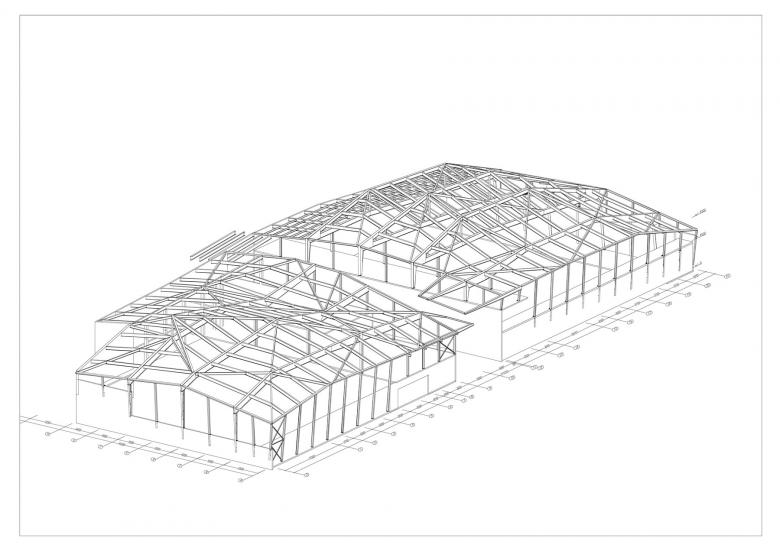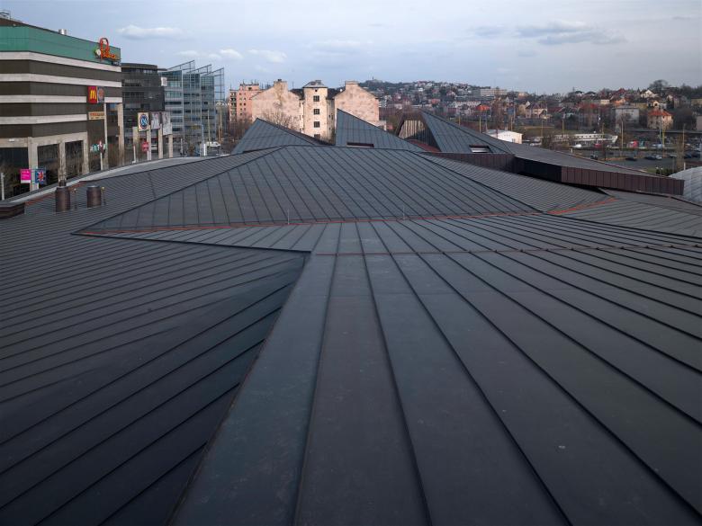 A major sports building in Budapest, Hungary mutates its straightforward rectangular plan into a complex faceted copper roof-space.