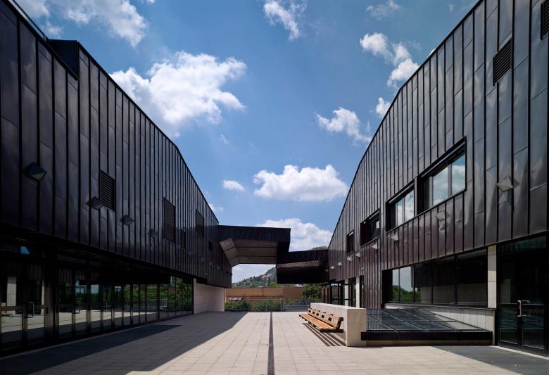 The sports building is connected to the street level by an open air pedestrian area, kind of a special courtyard, created between the two building volumes. On the South side the swimming-pool area is directly opened to the large garden, home of several outdoor sporting grounds and outdoor pool as well.
