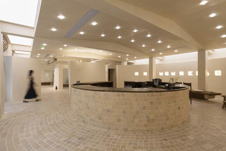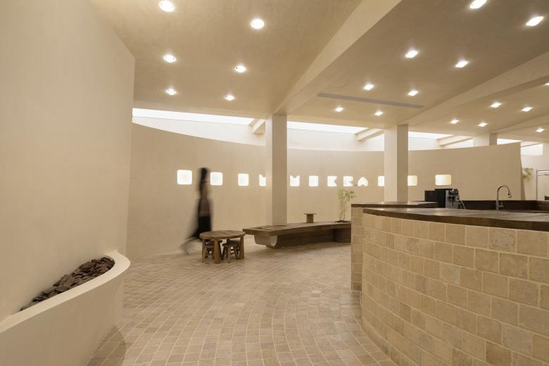 随着空间向内展开的是位于中央的前厅“内院”,圆形中岛收银台在此既是室内迎客的流线起点,也是选购的终点。两侧的陈列区入口墙面像泥塑般地拿捏糅合后,在互相映衬下谦逊地围绕着中岛前行显现。整个弧形背景面沿居中线向两侧从原墙面上逐渐分离出,又向中岛区缓缓收拢,模拟品牌字形的几何壁龛安静地嵌入其上,没有多余的装饰,瞩目、却不张扬。来此,无论是采买还是休息,“内院”总以包容的姿态等待着每一位客人。