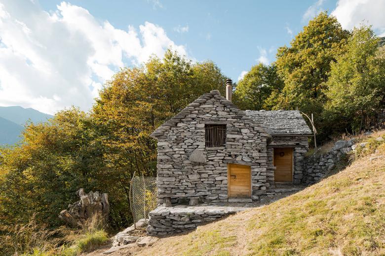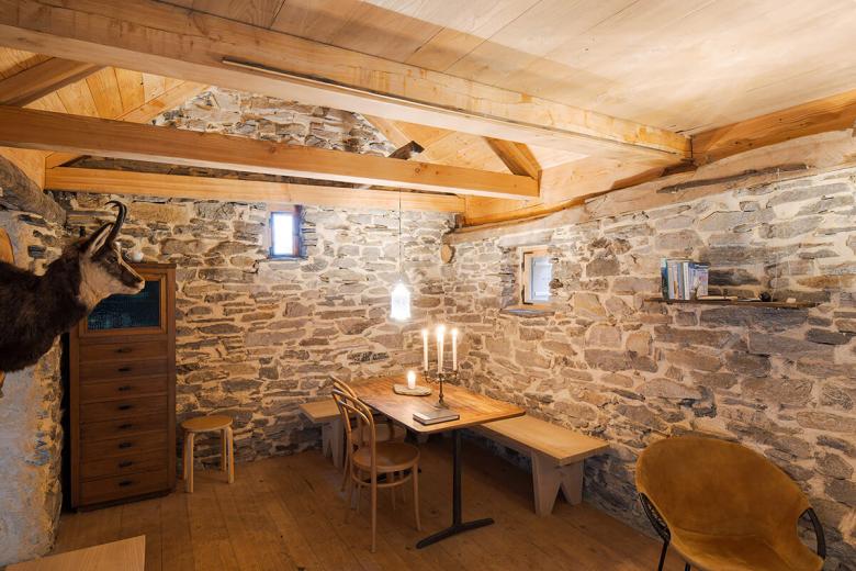 Beim Umbau wurden die luftig gemauerten Natursteine mit einer «Pietra Rasa» Technik mit Kalkmörtel so ertüchtigt, dass der Hauptraum als Sommerwohnraum nutzbar ist. Die Natursteinwände wurden teilweise, statisch ertüchtigt, und geflickt, best. Holzkonstruktionen ersetzt, repariert und ergänzt. Dabei achteten wir darauf im Sinne der archaischen Konstruktion angemessen weiterzubauen und stimmungsvolle Räume mit schöner Materialästhetik zu erzeugen.