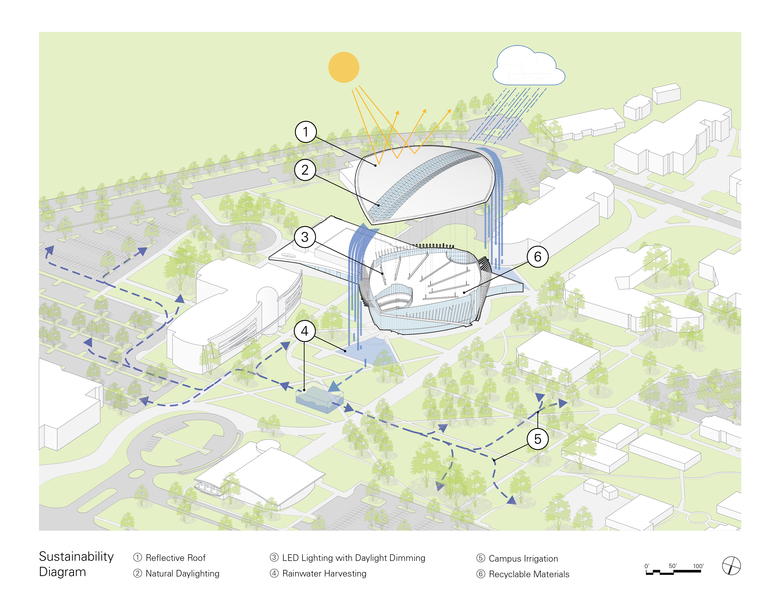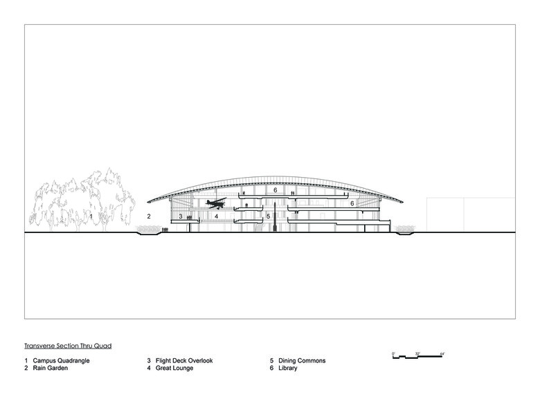 Internally, the student union building is an aeronautical athenaeum combining social learning spaces, events, dining and the University library. A soaring, triple-height commons anchors and integrates the collaborative social and learning interiors. Wrapping this space and open to it are lounges, dining venues, group study rooms, clubs and organizations, career services and the University library as well as an event center, creating a virtual “city within a city”. The 177,000-square-foot facility houses student lounge spaces, a dining commons and food court on the first floor. Also on the first floor is an events center that can accommodate up to 900 people and is divisible into six separate salons. The upper floors contain offices for student clubs and organizations, classrooms, computer labs and group study rooms. The top floor houses the University library which is set beneath a dynamic 200-foot arching skylight and opens the sky to the library. A roof terrace on the second floor allows students to gaze upon the adjacent runway of Daytona International Airport and beyond to rocket launches from Cape Canaveral.