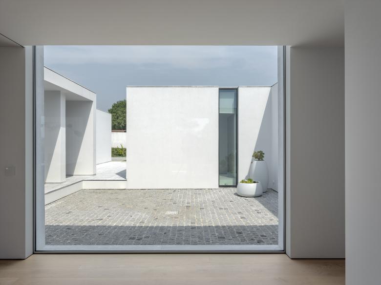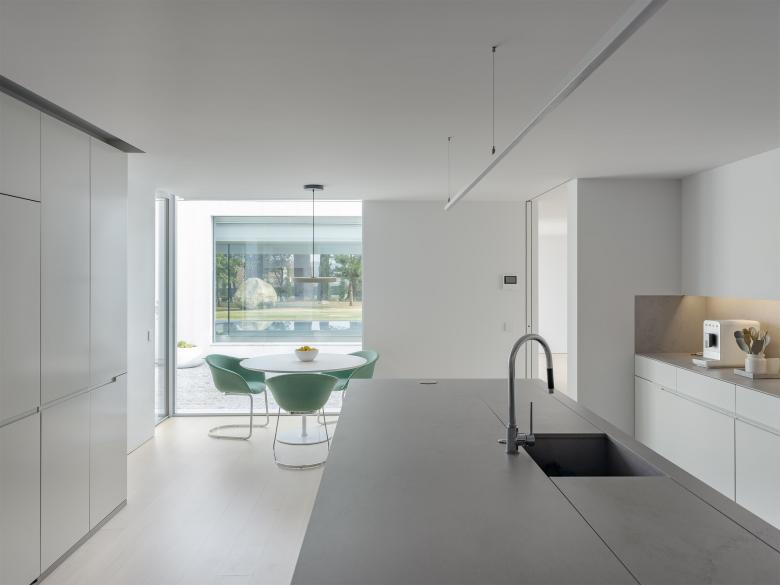 A central courtyard (atrium) was introduced to orient domestic spaces toward light, breeze, and family activity. The courtyard connects the kitchen, laundry room, garage, living room and corridors, guest bedroom, gym, and swimming pool.