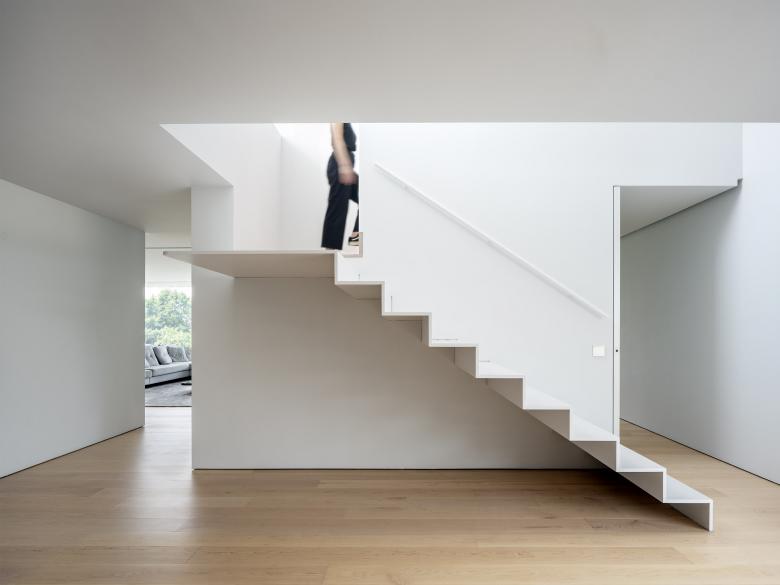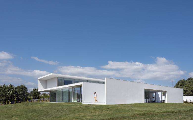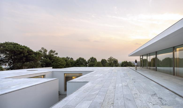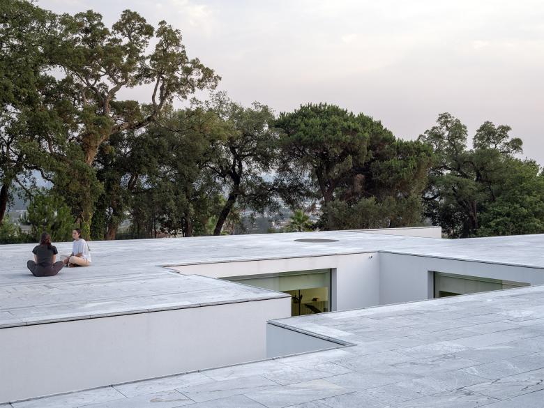 The entrance to the house is located on the north side. The ground floor, with 590 m², accommodates the social, leisure, and service spaces (including parking for four cars and a guest bedroom). The upper floor covers 212 m², divided into three south-facing bedrooms connected to the roof terrace.