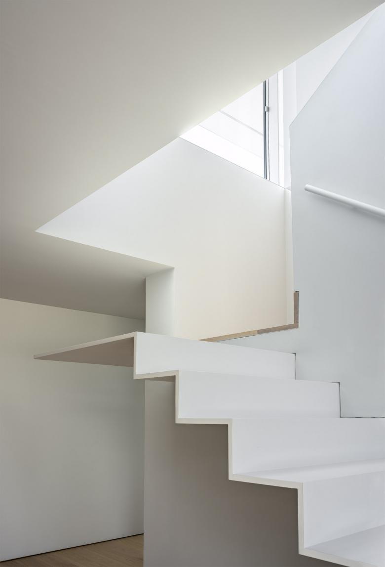 The “sheet of cardboard” extends over the bedroom volume, folds northward to create a blind façade, folds again horizontally to form the ground floor roof slab, and with two additional folds (and cuts) shapes the courtyards and the façade of the indoor pool.