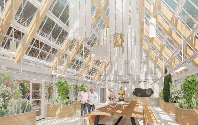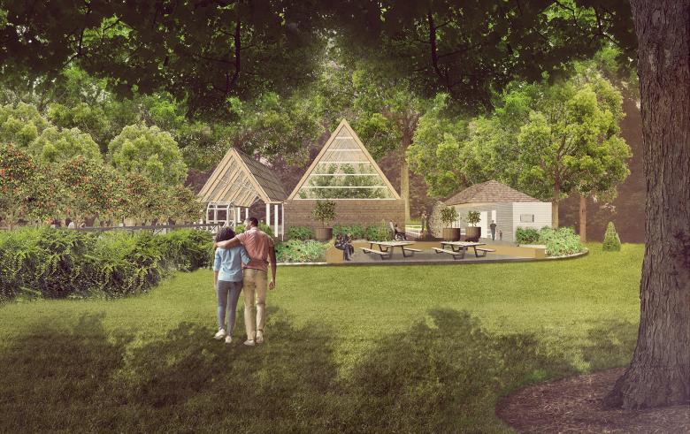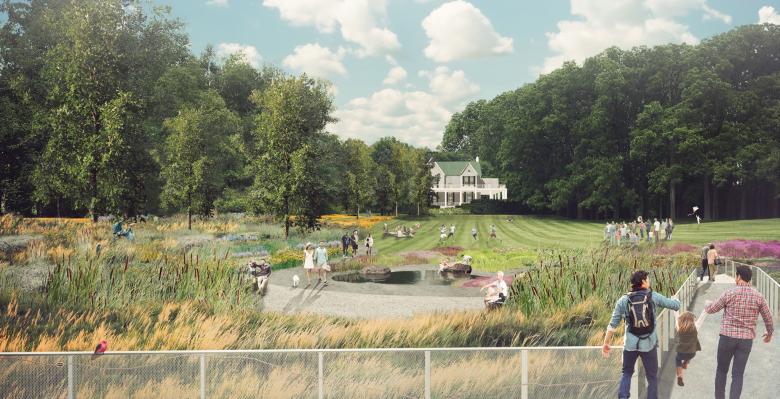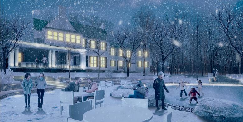 The architecture and landscape of the now-in-construction park are inseparably intertwined: its new structures and the transformed, repurposed outbuildings are modest in scale but thoughtfully configured to introduce cultural and landscape themes along paths throughout the site. A new entry bridge spanning a constructed wetland transforms the marshy, formerly underused southwest corner at Yonge Street and Mulock Drive into new public space. Other destinations include a riverine water feature celebrating the site’s moraine geological formations; a 350-metre woodland skating loop; a four-season skate pond/splash-pad plaza with a new pavilion; the estate’s garage and stables, repurposed for public use as a conservatory and artist residency; community diversity gardens and orchard; a restored and reinterpreted formal historic garden; and a natural playground with the regenerative life cycle of a forest’s trees as its theme. Visitors can explore re-naturalized, restored woods, picnic on expansive lawns, and tour nine permanent artworks commissioned for specific site locations, plus temporary artworks generated from the artist residency.