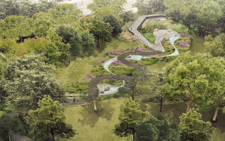 Low-impact development strategies include prioritizing re-naturalization, green roofs, stormwater retention, and groundwater purification via the new park’s enhanced wetland. All new planting is native, with an emphasis on climate-change-resilient species that promote biodiversity.