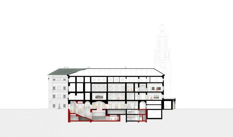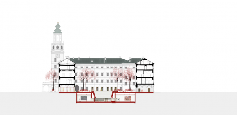 Die Treppenanlage, die die Ausstellungsräume des Belvedere Museum vertikal erschließt, ist in den historischen Bestand der Neuen Residenz aus dem 17. Jahrhundert integriert. Der historische Lichthof wird erhalten und das Gewölbe denkmalpflegerisch sensibel freigelegt. Die BesucherInnen betreten die beiden Höfe der Neuen Residenz von drei Seiten über die drei mächtigen, frühbarocken Portale jeweils vom Residenz- oder Mozartplatz oder von der Kaigasse.
