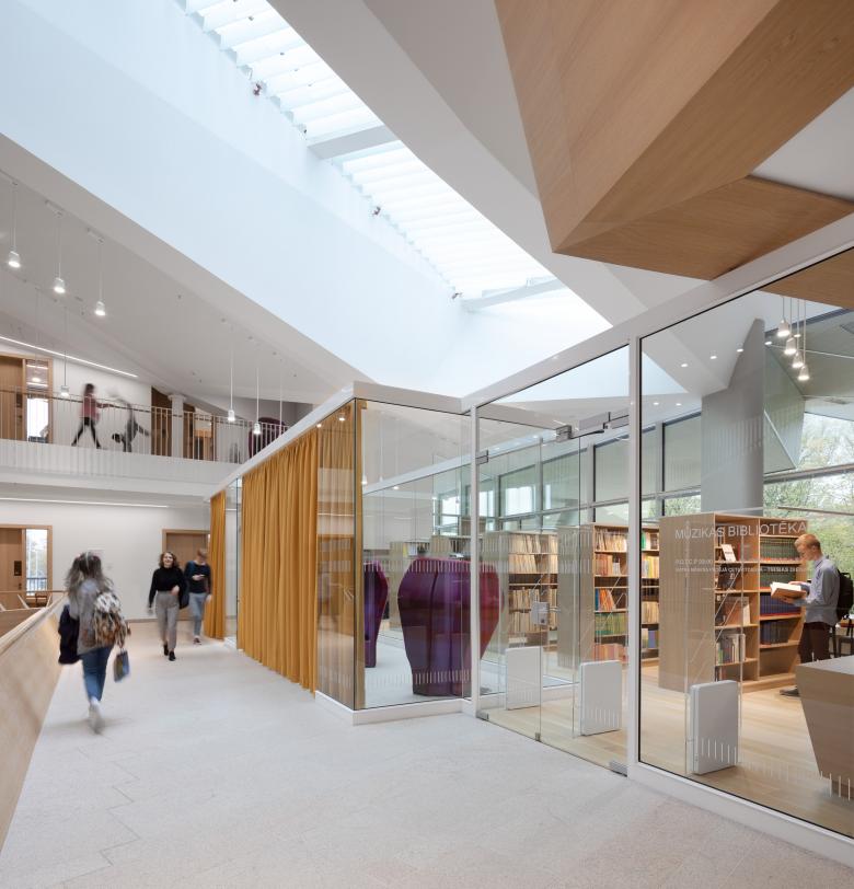 Unter dem charakteristischen Dach sind unterschiedliche Räume, innen wie außen, beherbergt. Es bietet Schutz vor den extremen Wetterverhältnissen und verleiht dem Gebäude ein unmittelbar erkennbares Erscheinungsbild als Wahrzeichen. Die Musikschule bietet eine Reihe unterschiedlicher, für die Öffentlichkeit zugänglicher Aufführungsräume, wie einen 600 Sitzplätze fassenden, klassischen Konzertsaal, einen kleineren Theater Saal, eine Musikbibliothek und eine Außenbühne sowie ein Amphitheater. Die jeweiligen Backstage-Bereiche befinden sich auf drei Ebenen und fassen die Bühne des Konzertsaals ein. Alle Innenräume wurden nach den höchsten akustischen Standards entwickelt, um zwei Aufführungen gleichzeitig ungestört in den beiden Sälen stattfinden zu lassen. Das Raumerlebnis wird geprägt durch den Kontrast zwischen den einfachen geradlinigen Formen der Konzerthalle und den umschließenden frei geformten Foyerflächen, die sich mit Balkonen und Terrassen zum Lielais Laukum öffnen. Die Foyers werden flankiert durch die Cafeteria, die Musikbibliothek, den Green Room, das Aufnahmestudio und zahlreiche Unterrichtsräume.