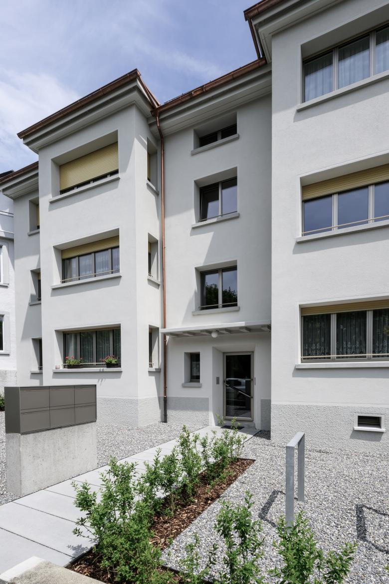Im Zuge der Sanierung wurden sämtliche Fassaden nach den Vorgaben des kantonalen Gebäudeprogramms mit einer hochwertigen Mineralfaserdämmung gedämmt, verputzt und gestrichen.