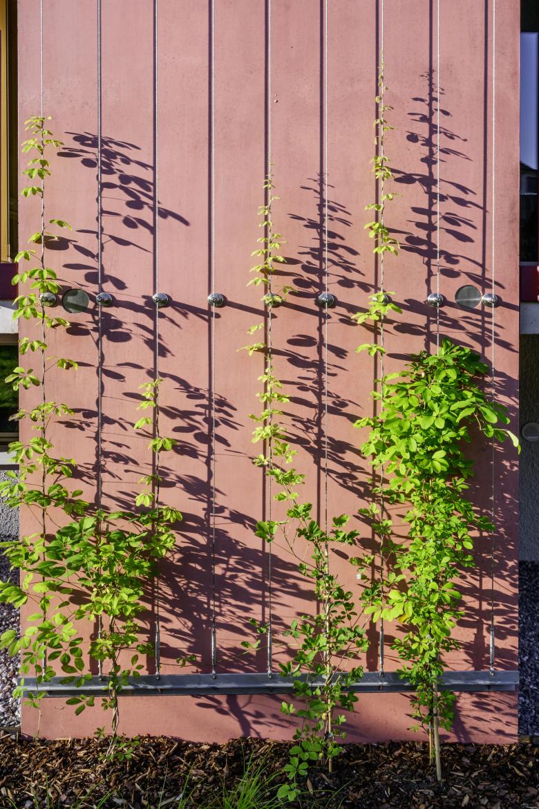 Die Pflanzkonzeption der Gehölze berücksichtigt sowohl ästhetische als auch ökologische Aspekte: Ein Blütenmeer im Frühling und eine intensive Herbstfärbung prägen den Jahresverlauf. Obwohl einige Obstgehölze im Zuge der baulichen Massnahmen entfernt werden mussten, wurde die Idee der produktiven Gärten erhalten und durch gezielte Neupflanzungen sogar gestärkt. Die neu gepflanzten Gehölze und Hecken setzen die bestehende Gartenstruktur fort und schaffen ein differenziertes, vielschichtiges Freiraumangebot mit starkem Bezug zur Geschichte des Ortes.