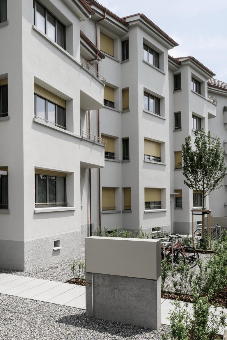 Die bestehende Vorgartensituation entlang der Florastrasse wurde aufgegriffen und gestalterisch aufgewertet. Neue Elemente zur Förderung der nachbarschaftlichen Begegnung wurden integriert, während die klare Raumstruktur durch Schnitthecken beibehalten und gestärkt wurde. Diese Hecken übernehmen dabei auch die Funktion eines Sichtschutzes zur angrenzenden Strasse und tragen zur Rückzugsqualität der gemeinschaftlichen Freiräume bei.