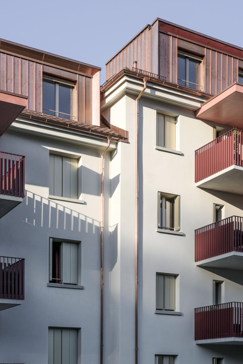 Die Statik der Balkone übernehmen raumhohe Z-Elemente, welche die horizontalen, auf beiden Seiten weit auskragenden Betonplatten tragen. Durch die abgewinkelte Geometrie dieser Elemente entstehen kleine Aussenräume, welche als Aussenreduits, die in ihrer Fläche um gut das Doppelte vergrösserten Balkone zusätzlich aufwerten. Gleichzeitig schaffen die Z-Elemente räumliche Distanz zwischen den Nutzern und garantieren die geschätzte Privatsphäre.
