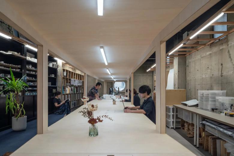 私たちは事務所にいるとき、ほとんどの時間机の前に居る。図面を描いたり、打ち合わせ、食事、休憩など全てを行う。私たちにとって机は、個人で使用する「デスク」のようでもあり、大勢で使用する「テーブル」のようでもあり、それ自体が「室」のようなものでもある。そんな何にでもなれる机のあるオフィスをつくった。