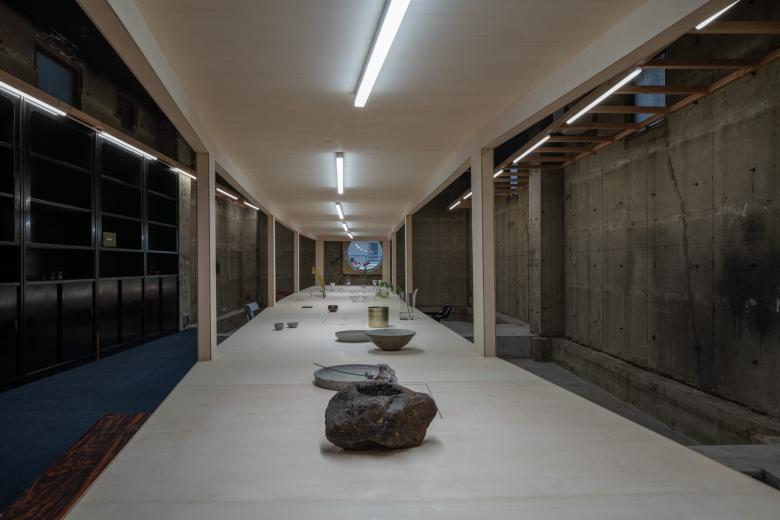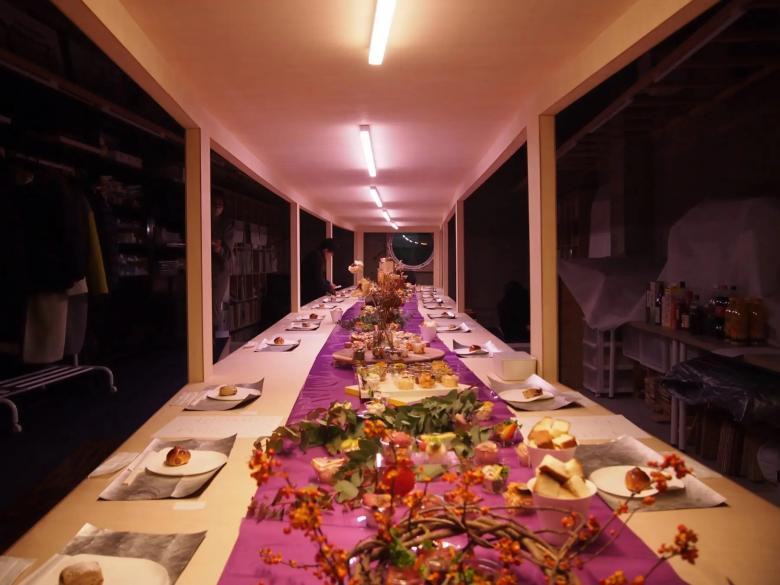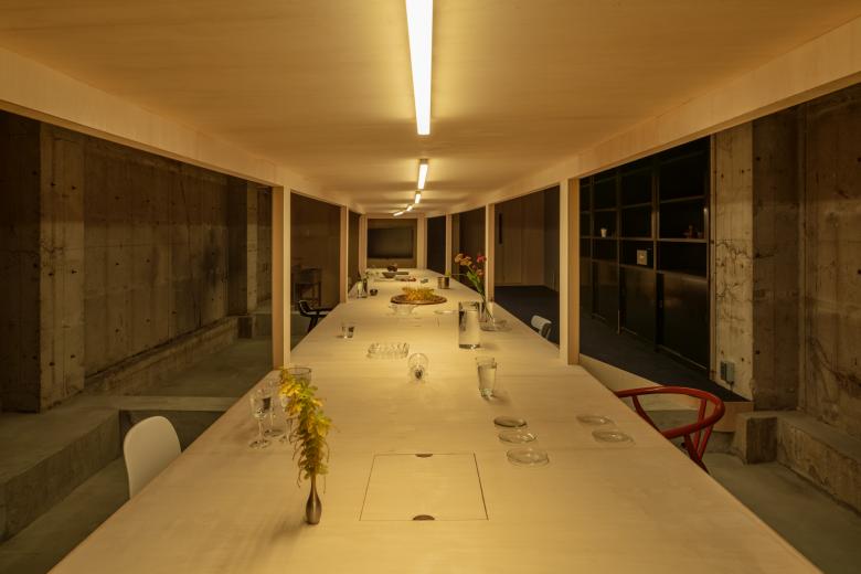 オフィスのあるエリアは夜の街が色濃い場所だったが、徐々にビルの建て替えやテナントの入れ替えが進み、高層マンションも多くでき始めている。当時の独特な色使い、華やかさの痕跡を残し、この地の繁栄の歴史を刻みたいと思い、この机は何色にも変化する照明の仕掛けを用意した。作業机でもあり、長テーブルでもあり、ギャラリーやショップのようでもある、程よく何にでもなれそうな加減を有している。