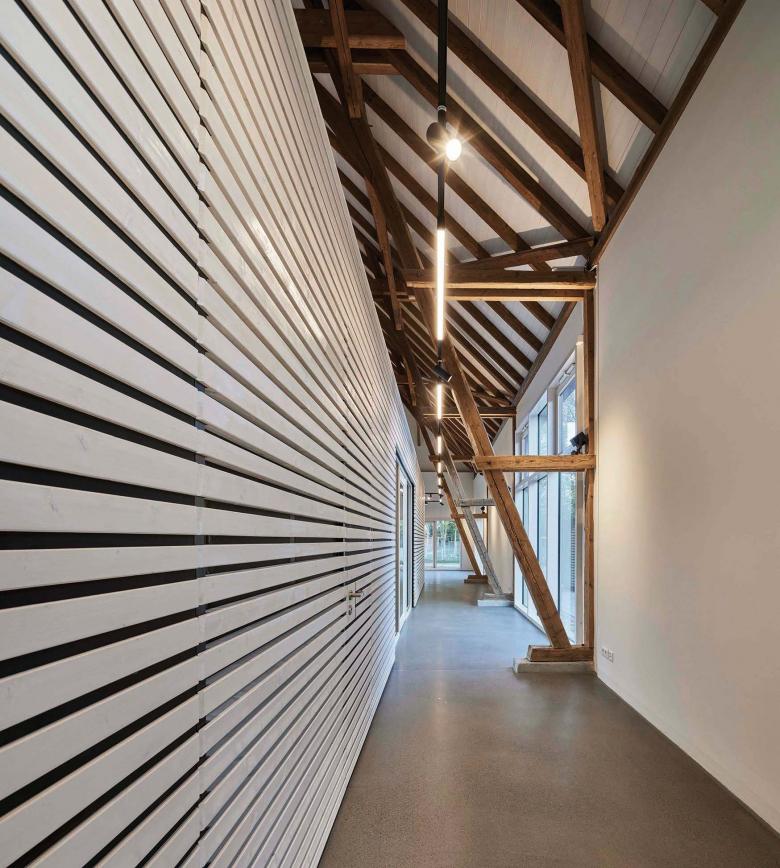Das vorhandene Gebäudevolumen fungiert heute als interaktiver Ausstellungs-, Lern- und Informationsort. Herzstück und Mittelpunkt ist der nach dem Haus-in-Haus-Prinzip in das Volumen eingestellte Veranstaltungsraum mit Nebenräumen, der unter anderem für Workshops, Vorträge und Filmvorführungen genutzt wird. In sich abgeschlossen und vollständig in Holzbauweise errichtet, schafft er eine behagliche und warme Atmosphäre. Dieser Raumeindruck wird durch die sichtbare horizontale Leistenschalung noch verstärkt.