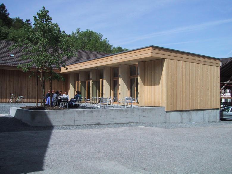 Quer zur alten Sägereihalle entsteht das neue Eingangsgebäude mit einem baumbestandenen Vorplatz. Das offene Erdgeschoss wird neben dem Eingang mit Kassenbereich auch für Vorträge und andere Aktivitäten genutzt. Die grosszügig verglaste Eingangsfront kann abends und im Winter mit raumhohen Holzläden geschlossen werden, wobei durch die um das gesamte Gebäude gleichmässig umlaufende Holzhaut eine homogene, körperhafte Wirkung entsteht. Die Innenwände und -decken sind mit naturbelassenen Dreischichtplatten verkleidet. Das Kassenmöbel in grau lasierten Dreischichtplatten integriert Kassentheke, Garderobe, Kaffeeküche und die Heizungs- und Lüftungsabzüge in einer hölzernen Figur, die den offenen Raum im Übergang zur Treppe ins belichtete Untergeschoss mit den Nebennutzungen prägt.