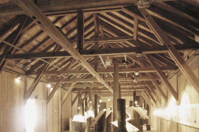 Die stützenlose Sägereihalle mit ihrer eindrücklichen Binderkonstruktion wird als Ausstellungshalle genutzt und in ihrer Struktur weitmöglichst belassen. Die Aussenhaut wird isoliert und innen wie aussen mit rohen Fichtenbrettern verkleidet. Der sanierte Keller bildet die Unterwelt zur darüberliegenden Halle, mit alten steinernen Maschinensockel, die wie Skulpturen im niedrigen Raum stehen.
